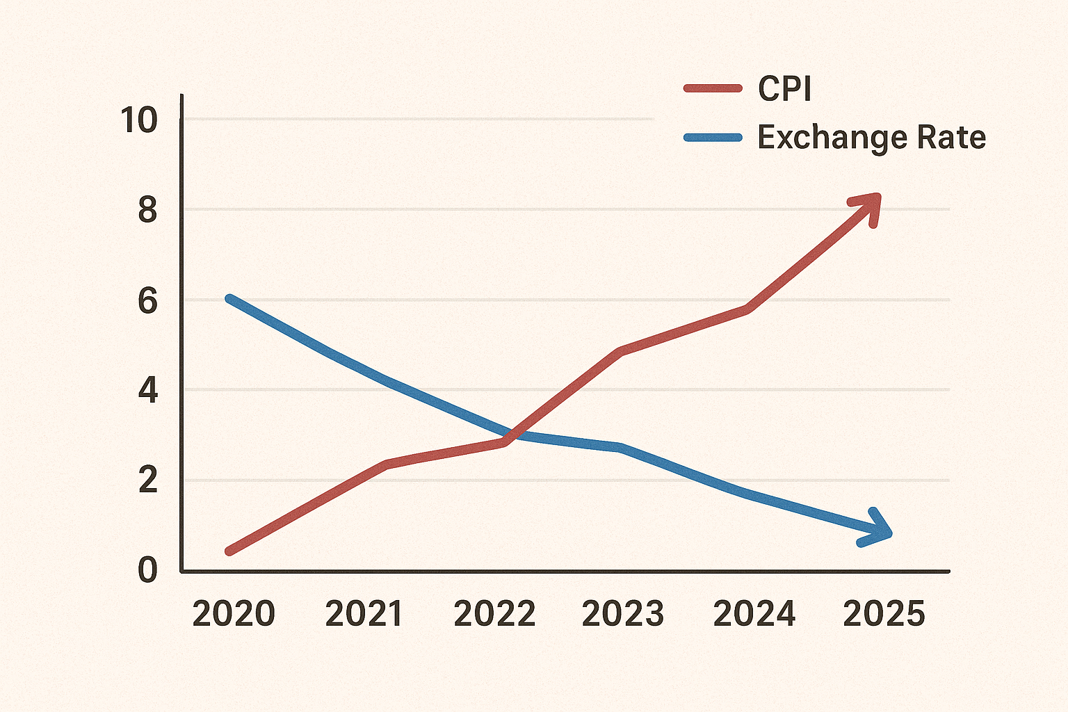 日本の物価指数と為替レートを対比した折れ線グラフ(2020〜2025年)